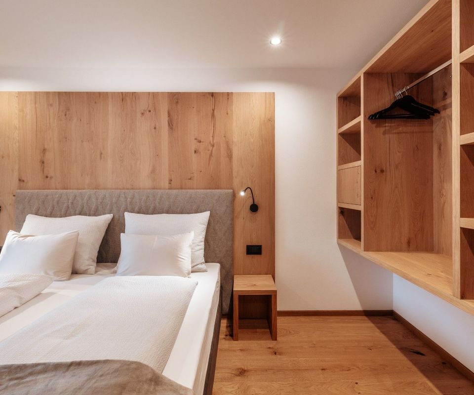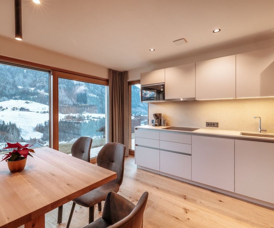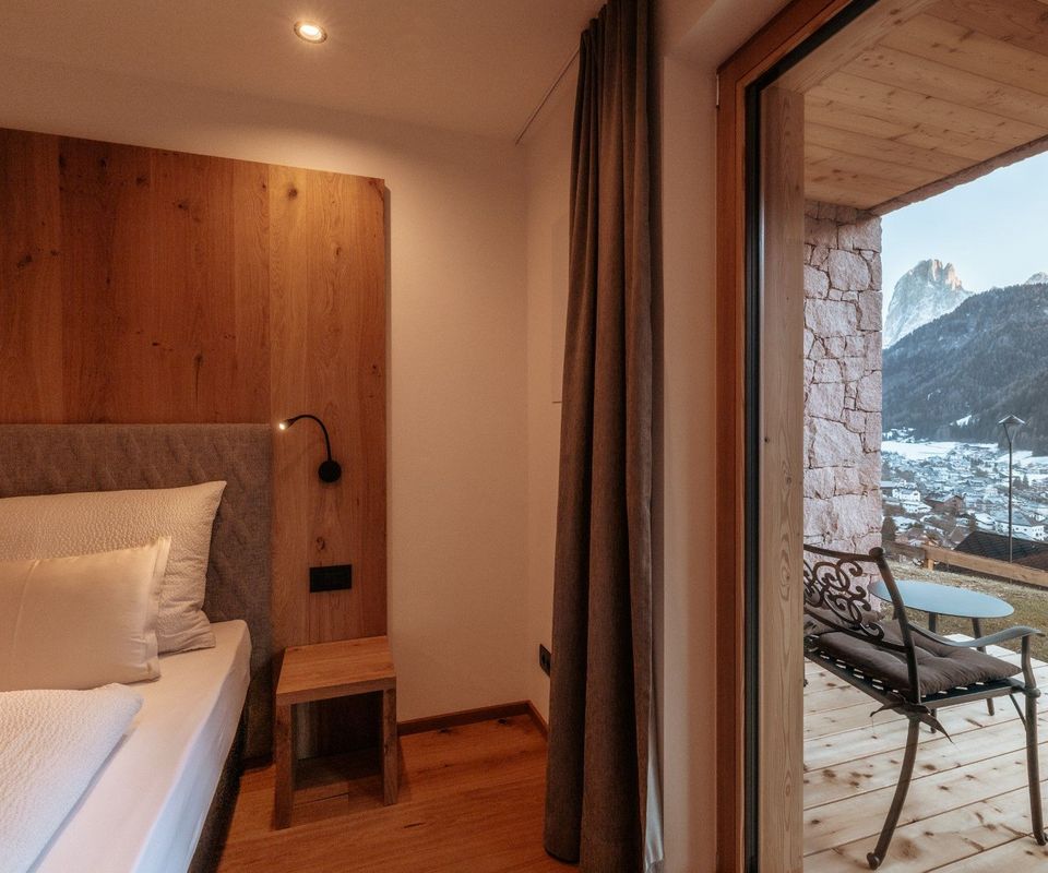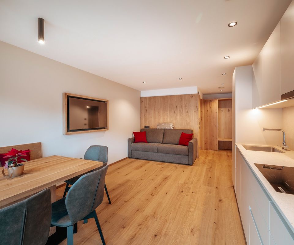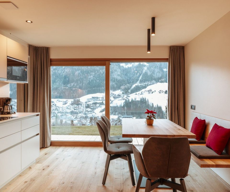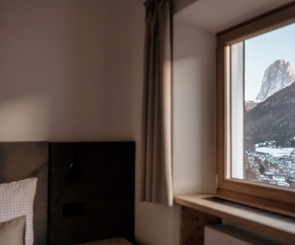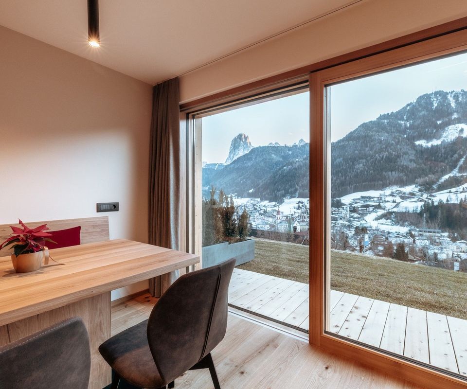 Diese 2 Apartments befinden sich im neuen Klimahaus A. Sie sind modern eingerichtet, mit Holzböden, großen Panoramafenstern, Terrasse und traumhafter Aussicht nach Süden – auf Langkofel, Plattkofel und den Sellastock. Was dich erwartet: